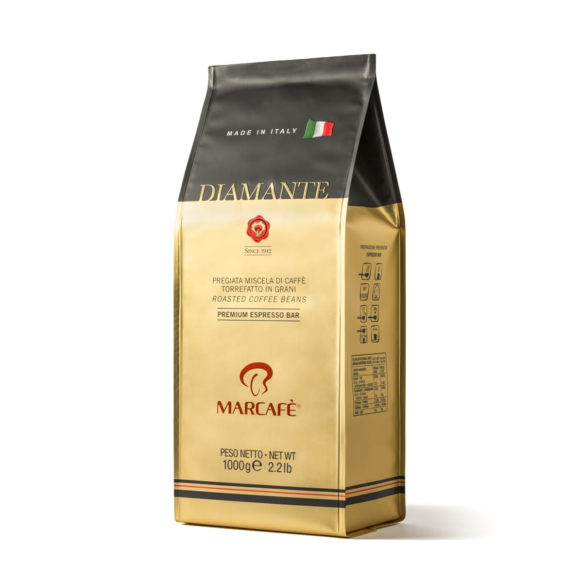 تمنحك Diamante مزيجًا متوازنًا من الإسبريسو الإيطالي، مع 60% أرابيكا لمزيد من النعومة و40% روبوستا لإضفاء القوة والتركيز. نكهة غنية وكريما كثيفة تعكس الجودة الإيطالية في كل فنجان.