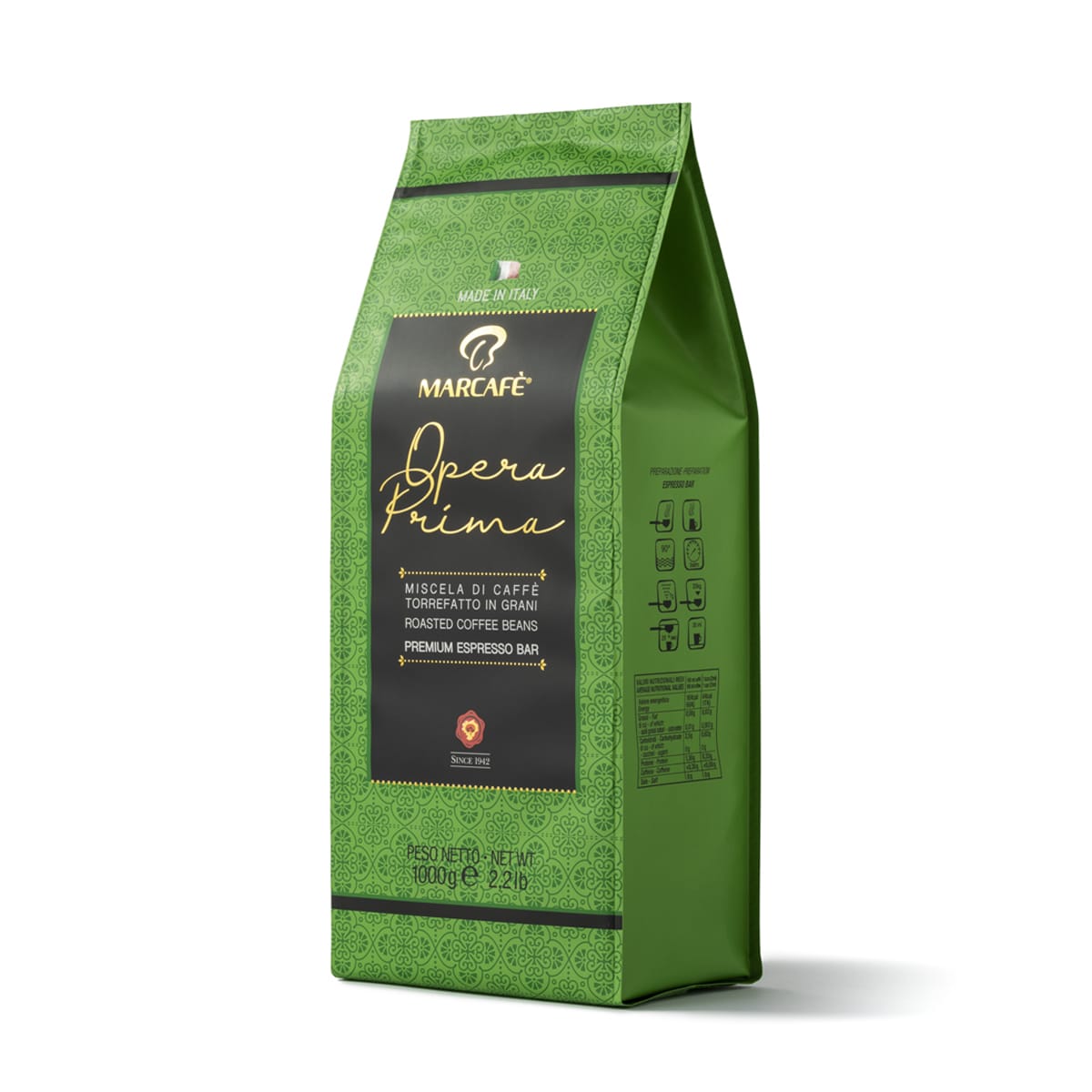 تمنحك Opera Prima تجربة إسبريسو عالية الجودة بتركيبة غنية تعتمد على 90% من أجود حبوب الأرابيكا. نكهة متوازنة، عطر قوي، وقوام ناعم يعكس أصالة القهوة الإيطالية في كل فنجان .